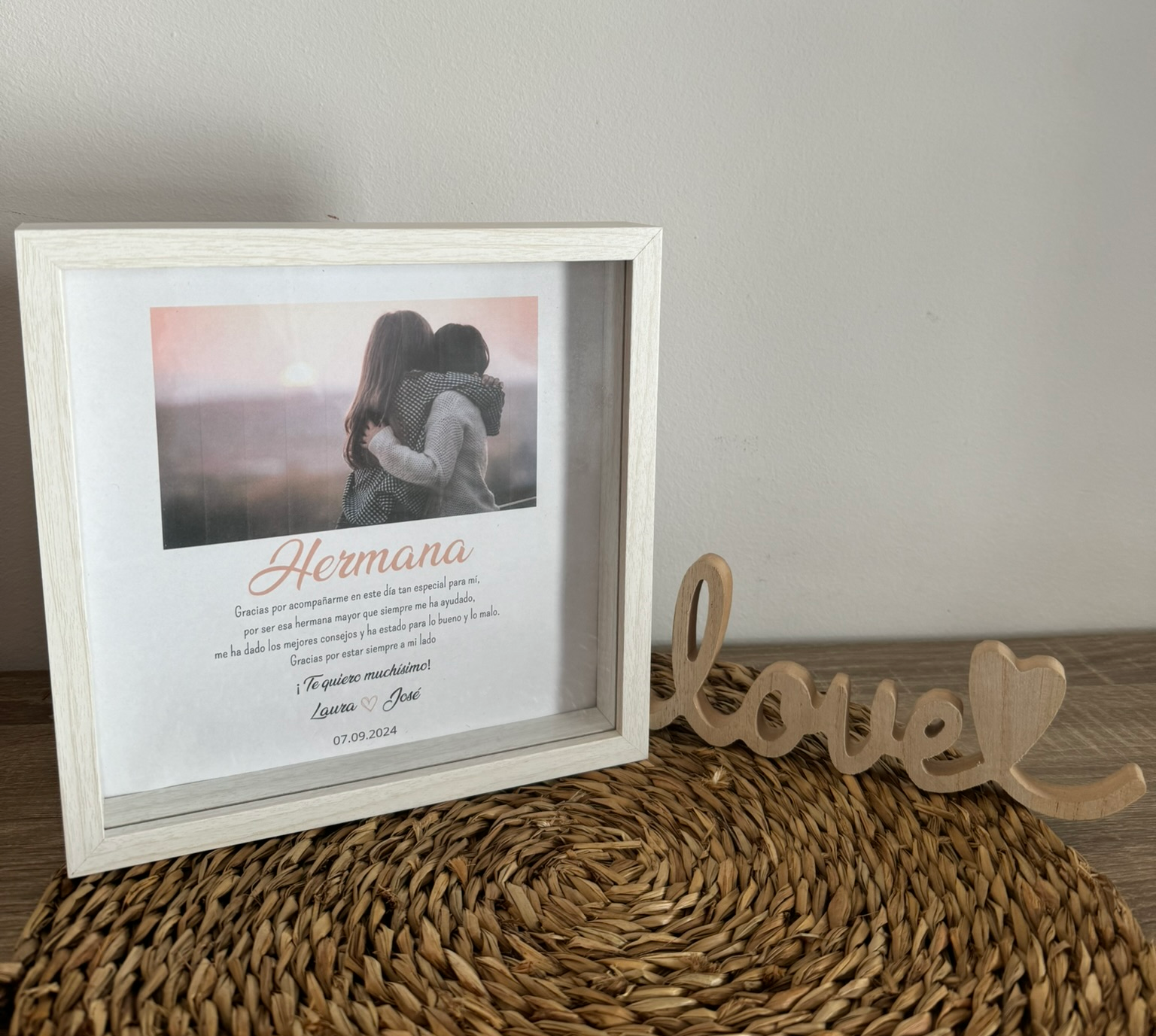 Sorprende el día de tu boda a tu hermana con este cuadro personalizado, acompañado de una bonita dedicatoria.