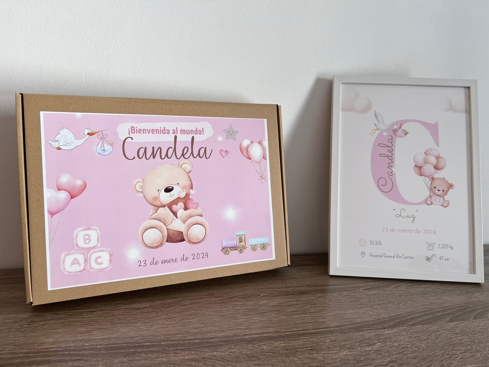 Puedes añadir caja regalo que incluye una pegatina personalizada de la misma temática que la lámina de nacimiento. "Bienvenido al mundo", el nombre del bebé y la fecha de nacimiento.