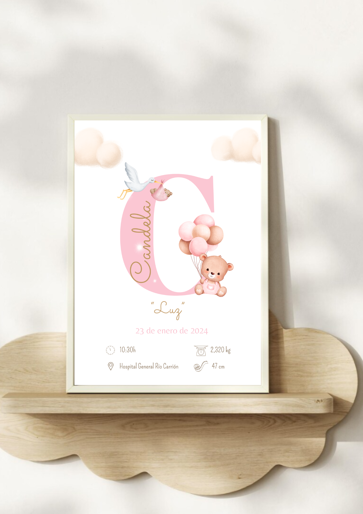 Celebra uno de los momentos más especiales de tu vida con una lámina de nacimiento única, tierna y totalmente personalizada. Diseñada con un estilo único y elegante, esta lámina incluye los datos más importantes de su nacimiento (nombre, fecha de nacimiento, peso, medida, hora y lugar de nacimiento) acompañada del significado de su nombre, para que no solo recuerdes el día en que llegó al mundo sino también el bonito mensaje que su nombre transmite.