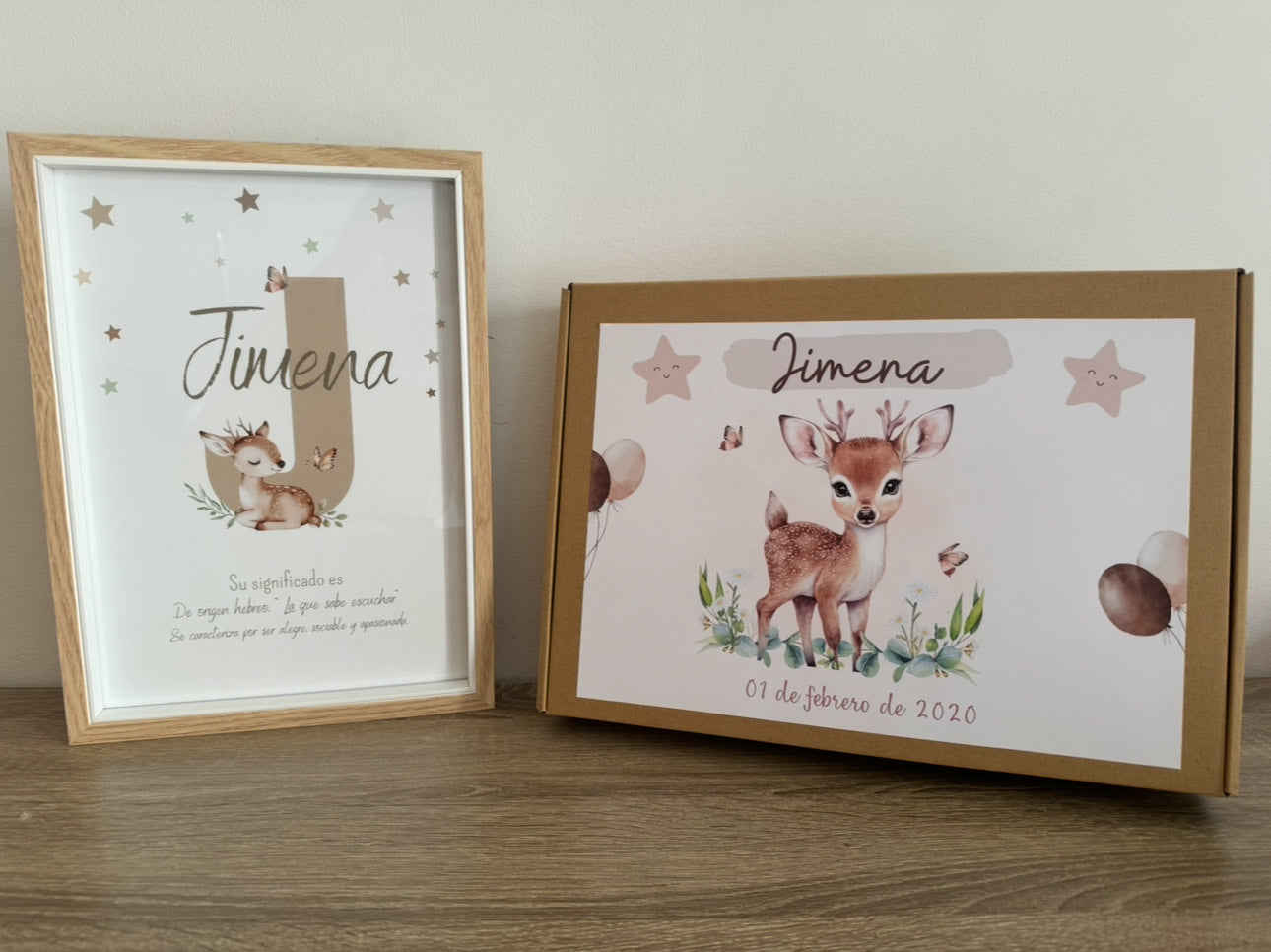 Puedes añadir caja regalo que incluye una pegatina personalizada de la misma temática que la lámina de nacimiento. "Bienvenido al mundo", el nombre del bebé y la fecha de nacimiento.