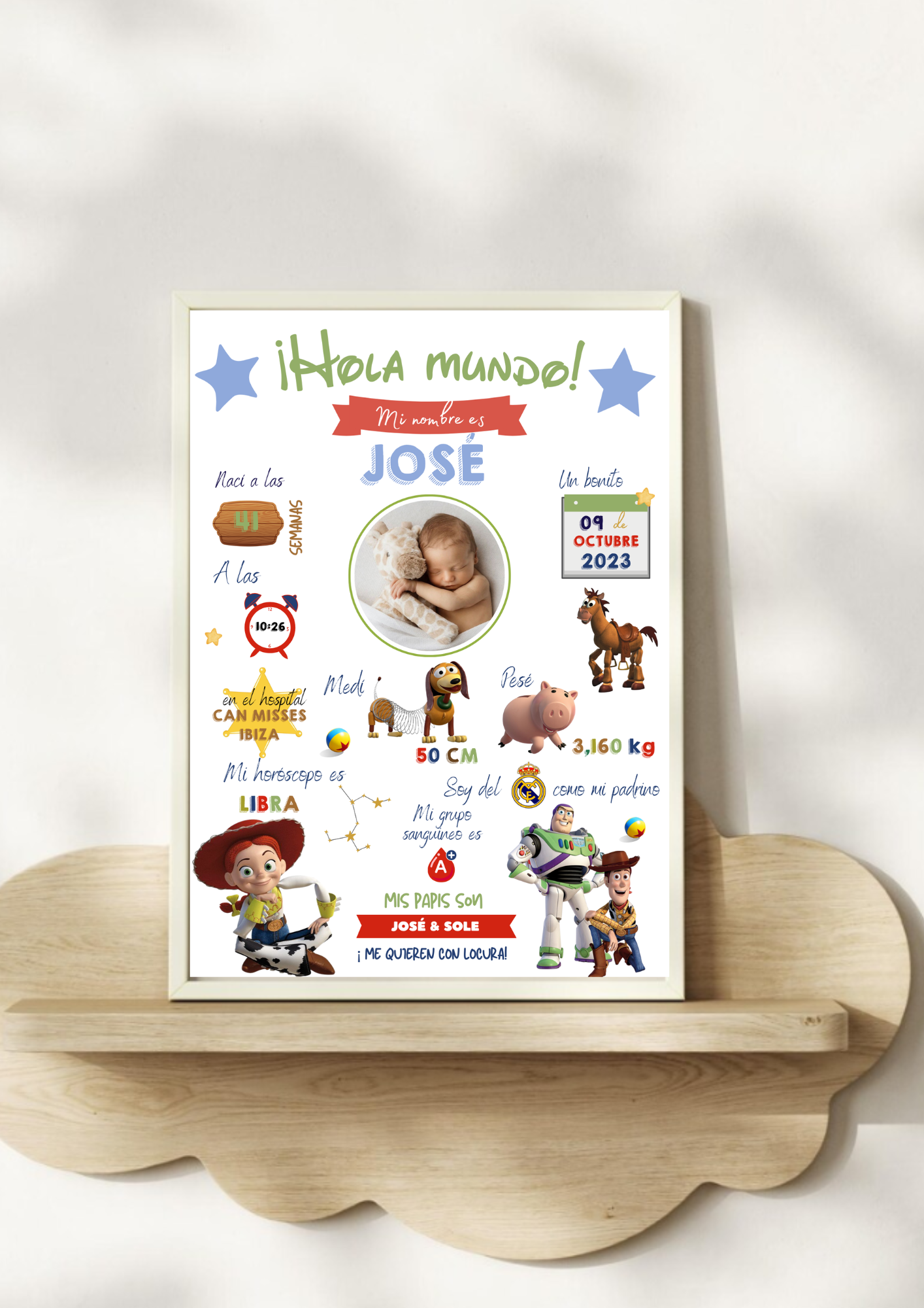 Celebra uno de los momentos más especiales de tu vida con una lámina de nacimiento única, tierna y totalmente personalizada. Diseñada con un estilo único y elegante, esta lámina incluye los datos más importantes de su nacimiento (nombre, fecha de nacimiento, peso, medida, hora, hospital de nacimiento, grupo sanguíneo, semanas de gestación, signo del zodíaco, nombre de los papás o otros datos relevantes) acompañada de la foto de tu bebé