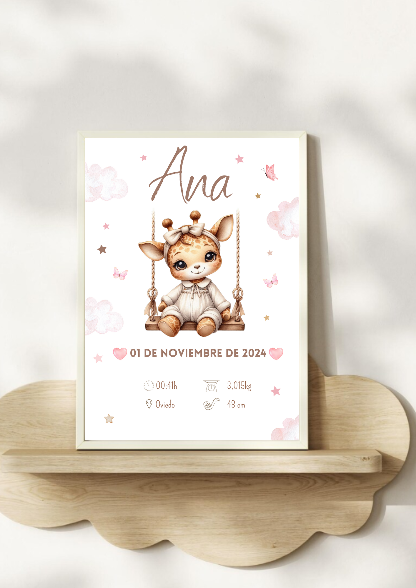Celebra la llegada de tu bebé con esta bonita lámina personalizada de nacimiento, en la que podrás grabar los detalles del día en que nació tu bebé. Incluye su nombre, fecha de nacimiento, peso, medida, hora y lugar de nacimiento.