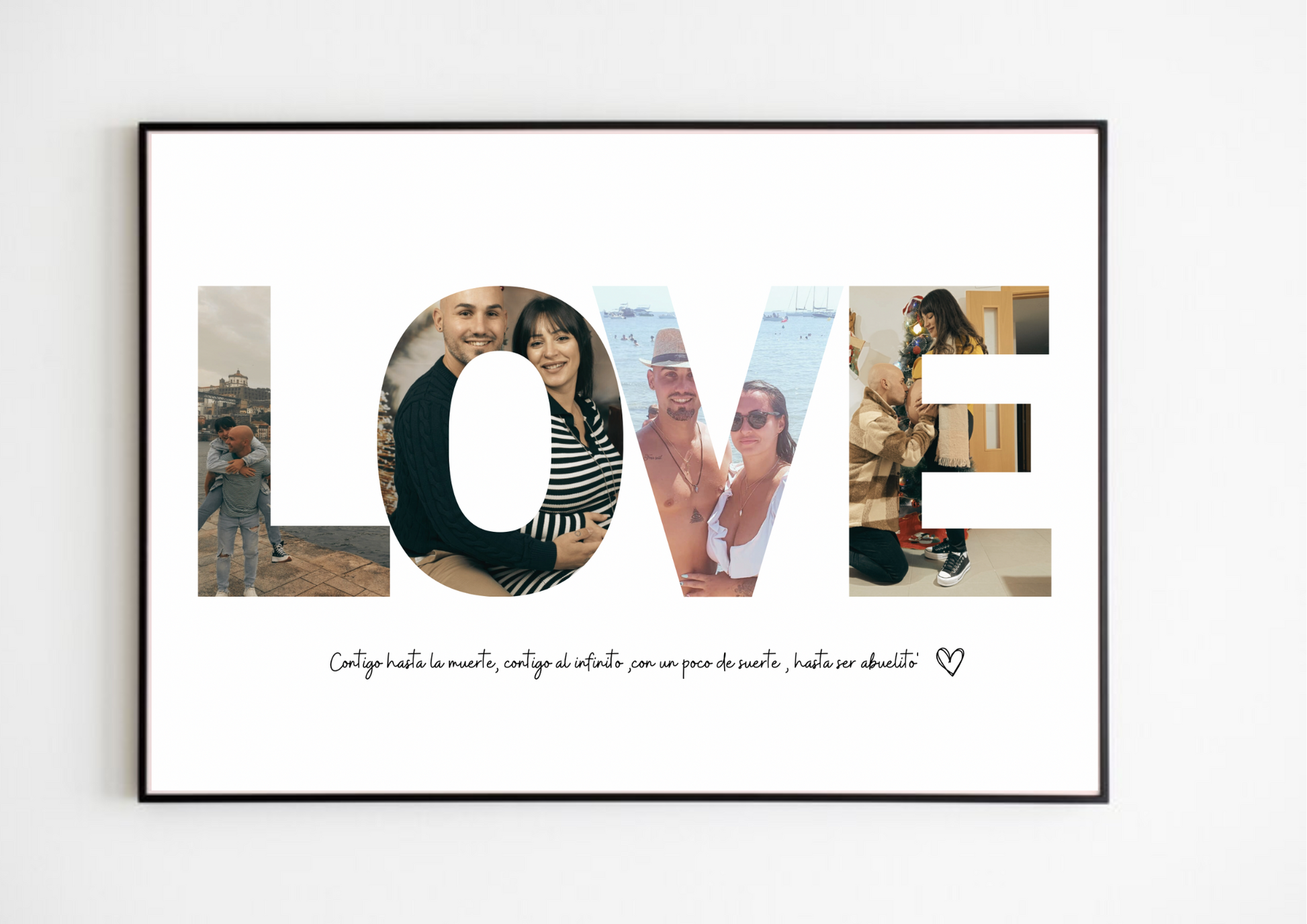 Esta lámina esta formada por la frase Te quiero que incluye varias fotos vuestras, acompañada de una bonita frase personalizada y vuestros nombres o vuestra fecha