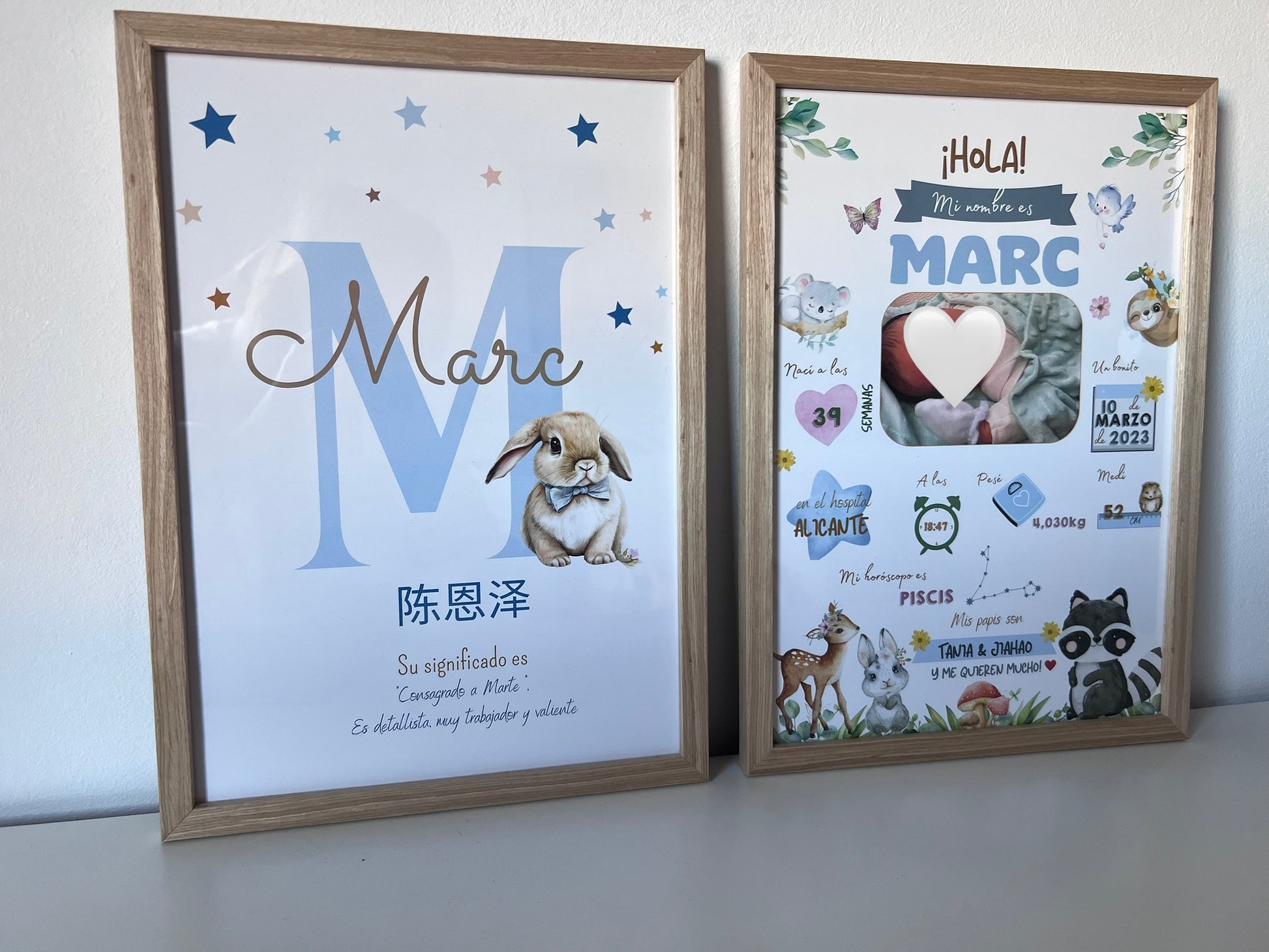 Incluye 1 lámina con los datos más importantes de su nacimiento (nombre, fecha de nacimiento, peso, medida, hora y lugar de nacimiento) acompañada de otra lámina con el significado de su nombre, para que no solo recuerdes el día en que llegó al mundo sino también el bonito mensaje que su nombre transmite.