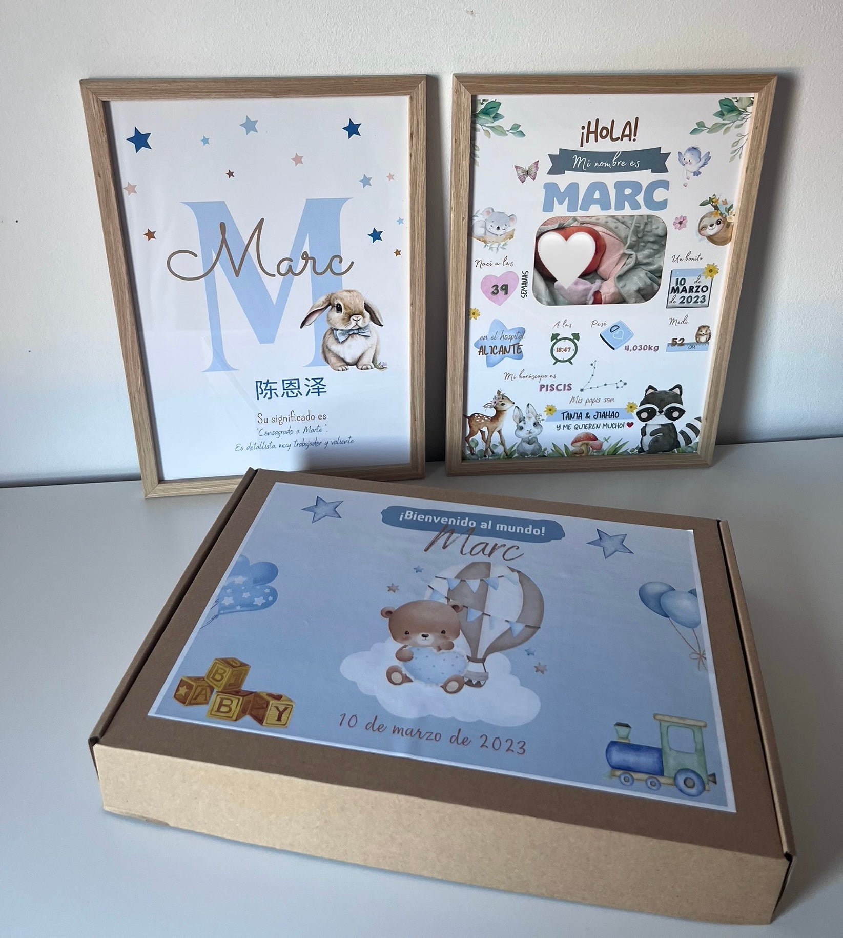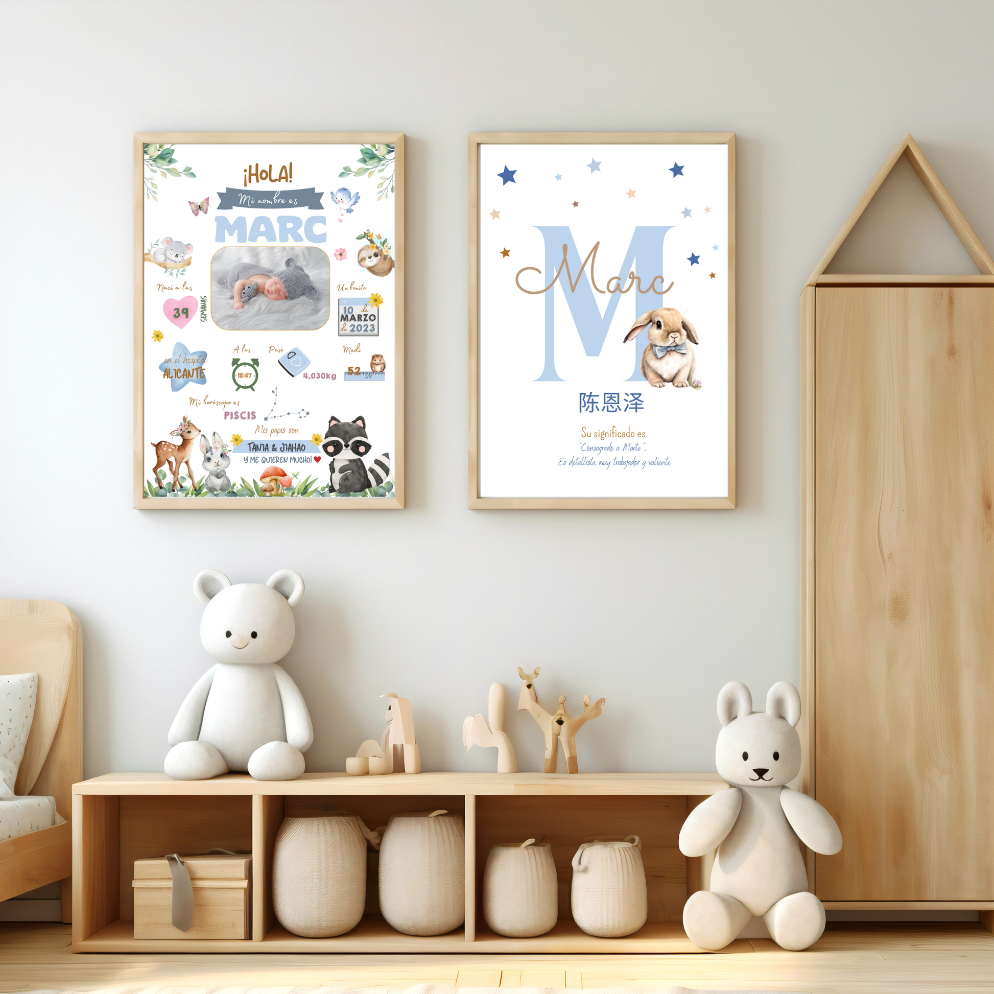 Celebra la llegada de tu bebé con este precioso pack de láminas personalizadas, ideal para decorar su habitación y guardara para siempre los recuerdos más especiales del día en que llegó al mundo. Diseñada con un estilo único y elegante.