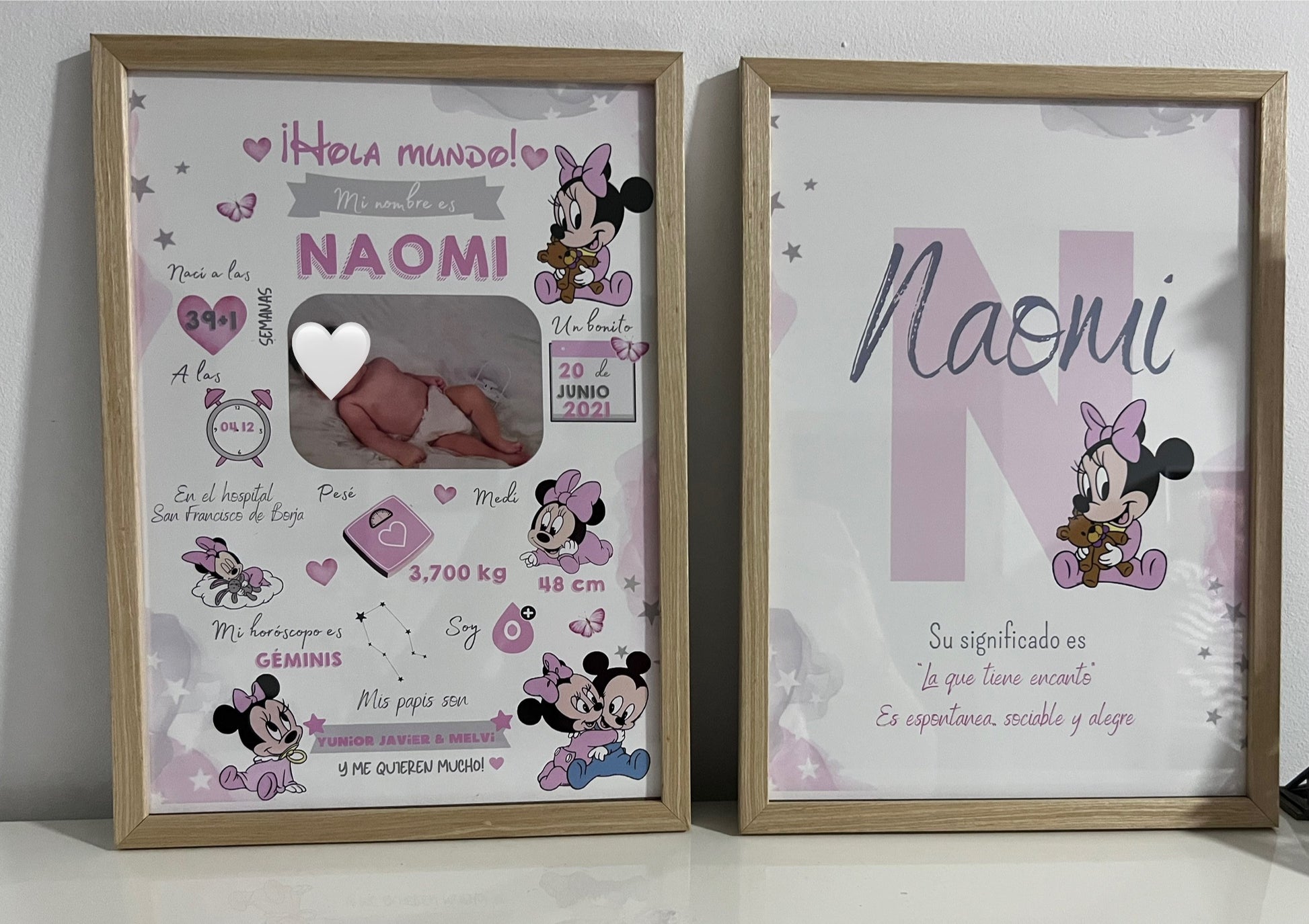 Incluye 1 lámina con los datos más importantes de su nacimiento (nombre, fecha de nacimiento, peso, medida, hora y lugar de nacimiento) acompañada de otra lámina con el significado de su nombre, para que no solo recuerdes el día en que llegó al mundo sino también el bonito mensaje que su nombre transmite.