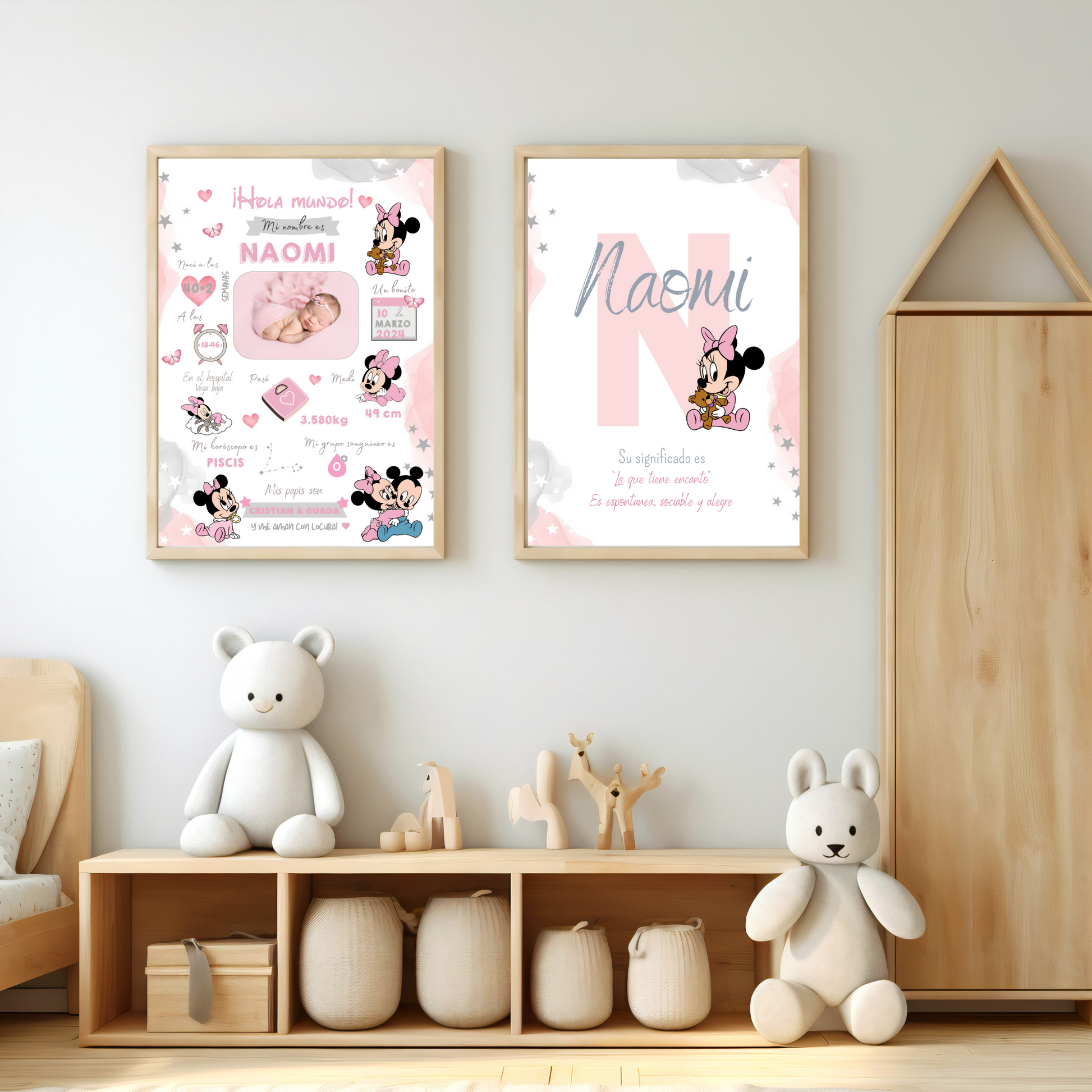 Celebra la llegada de tu bebé con este precioso pack de láminas personalizadas, ideal para decorar su habitación y guardara para siempre los recuerdos más especiales del día en que llegó al mundo. Diseñada con un estilo único y elegante.