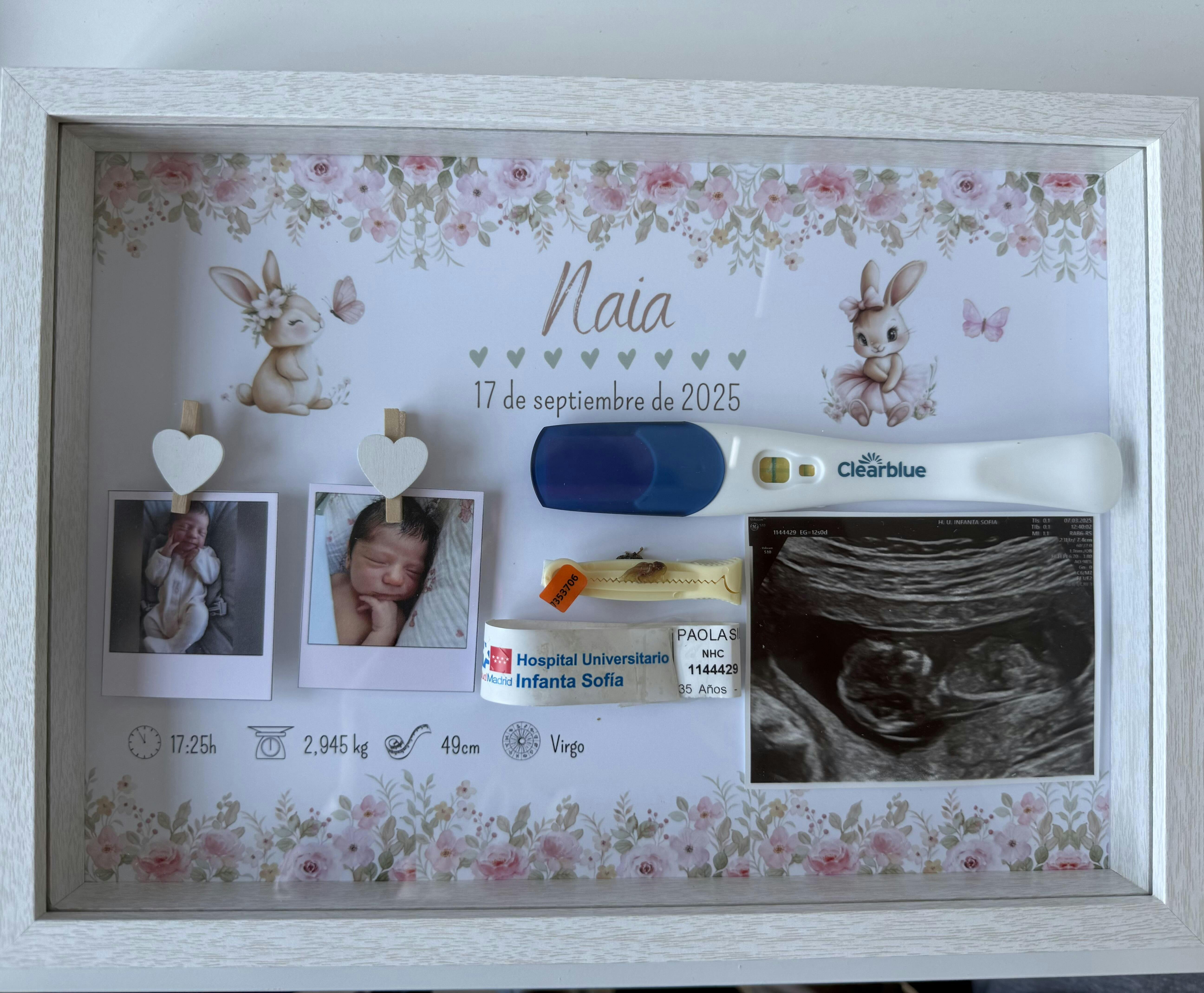 Este cuadro personalizado es ideal para guardar todos los recuerdos del nacimiento de tu bebé recién nacido, desde la pulsera del hospital, el predictor, tus ecografías hasta su primer mechón de pelo, su primer chupete o cualquier detalle especial de su nacimiento.